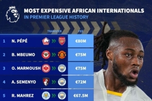 體育資訊1月9日訊 伯恩茅斯前鋒塞梅尼奧以7200萬歐元的價格加盟曼城,根據德轉統計,他成為英超歷史上轉會費第四高的非洲球員,僅次于尼古拉斯·佩佩、姆伯莫和馬爾穆什。