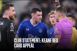 體育資訊1月9日訊 埃弗頓足球俱樂部遺憾地宣布,關于邁克爾·基恩在周三對陣狼隊的英超比賽中被罰下場的上訴已被英足總小組駁回。