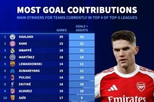 體育資訊1月9日訊 《轉會市場》統計了本賽季五大聯賽排名前四的球隊各自主力中鋒的參與進球情況,哈蘭德、凱恩、姆巴佩分列前三,戴維、約克雷斯、貢薩洛·拉莫斯列倒數前三。