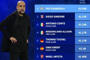 瓜迪奧拉執(zhí)教曼城以來主帥引援花費榜:(單位/歐元)