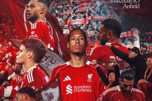 利物浦官方社媒發布了此役的海報,范戴克、?;倏?、薩拉赫、索博斯洛伊、加克波、凱爾凱茲出鏡。