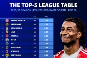 體育資訊1月9日訊 《轉會市場》統計了本賽季五大聯賽球隊場均拿分情況,拜仁、巴薩、皇馬分列前三。