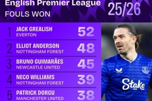 體育資訊1月10日訊 數據機構squawka統計了本賽季英超的造犯規情況,格拉利什居首。