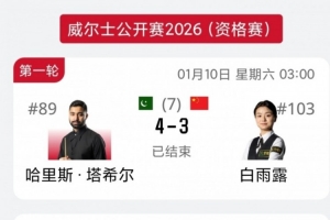 體育資訊1月10日訊 斯諾克威爾士公開賽資格賽首輪,白雨露3-4不敵哈里斯·塔希爾。