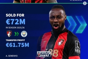 體育資訊1月10日訊 曼城已經官宣簽下塞梅尼奧,《轉會市場》統計顯示這也是伯恩茅斯近年來通過轉賣盈利最多的一筆交易(單位:歐元)。