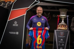 巴薩主帥弗里克手拿加維球衣與西超杯獎杯合影,他在加泰德比之前就曾拿加維的球衣與西班牙人主帥合影,最終巴薩客場2-0取勝。
