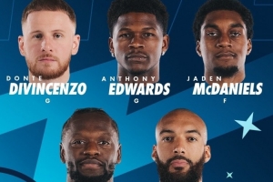 本場比賽森林狼首發名單:愛德華茲、迪文岑佐、麥克丹尼爾斯、蘭德爾以及戈貝爾。