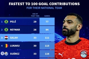 體育資訊1月11日訊 埃及在非洲杯八強戰3-2淘汰科特迪瓦,薩拉赫傳射建功,也達成了國家隊直接參與100球里程碑。《轉會市場》統計顯示他也是歷史第三快達成國家隊直接參與100球的球員。