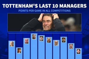 博阿斯場均拿到1.91分近10任熱刺主帥最多,波切蒂諾1.84分、穆里尼奧1.77分、孔蒂1.78分、澳波1.52分。