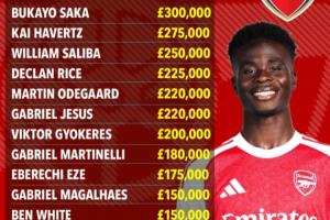 體育資訊01月11日訊 多方報道稱阿森納與薩卡敲定新合約,他將在阿森納拿到30萬鎊的隊內頂薪,《太陽報》羅列了阿森納隊內的最新周薪排名。