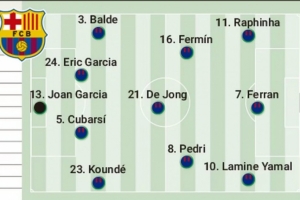 體育資訊1月11日訊 北京時間明天凌晨,巴薩將在西超杯決賽中對陣皇馬,《阿斯報》預測了巴薩此役的首發陣容。