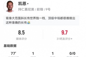 體育資訊1月12日訊 拜仁在本輪德甲7-1領先狼堡,凱恩本場數據如下: