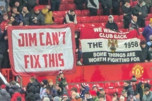現場的曼聯球迷打出了兩面橫幅,其一是“吉米(拉特克利夫的名字)解決不了這個”,另一面橫幅則寫著“我們想要回我們的俱樂部。1958。有些事是值得為之奮戰的。”