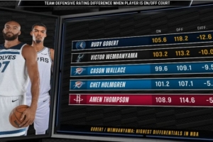 防守效率差:球員在場和不在場時,球隊每百回合失分差。