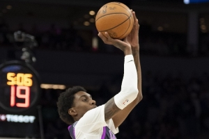 森林狼球員麥克丹尼爾斯上半場手感相當火熱,開場不久就上演空接暴扣,隨后更是三分三連擊幫助球隊將比分拉開。