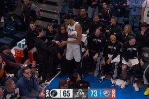 危險動作!文班跳起搶板 亞歷山大倒地夾住其腳導致摔倒!