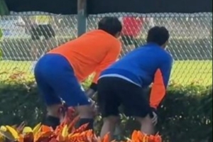 多支中超球隊正在海口備戰(zhàn)新賽季,其中包括山東泰山和青島西海岸,一段視頻顯示,泰山門將王大雷在訓練結束后透過圍欄觀看西海岸訓練。
