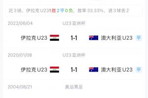 經(jīng)數(shù)據(jù)統(tǒng)計(jì),澳大利亞U23與伊拉克U23在U23亞洲杯歷史上共有兩次交鋒,兩場(chǎng)比賽兩隊(duì)均以1-1戰(zhàn)平,如果這場(chǎng)還是保持這樣的結(jié)果,最終積分榜形勢(shì)將是澳大利亞U23積4分,伊拉克U23積3分。