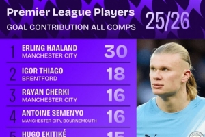 體育資訊1月14日訊 Squawka統計了本賽季英超球員各賽事的參與進球數量,并列出榜單,哈蘭德參與30球斷層居首。
