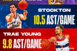 魔術(shù)師生涯場均助攻11.19次、斯托克頓為10.51次、特雷·楊為9.81次。