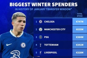 體育資訊1月15日訊 《轉會市場》統計了截止今年1月15日以來的冬窗歷史轉會總支出情況,切爾西力壓曼城居首,前十英超占據8席。