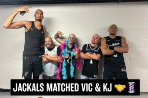 馬刺主場大勝雄鹿,賽后,文班亞馬和凱爾登·約翰遜與主場球迷團三位光頭球迷合影,馬刺官推寫道:“看來光頭造型正在流行~”