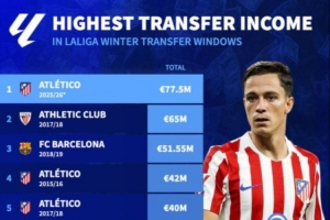 體育資訊1月16日訊 隨著出售拉斯帕多里和加拉格爾,根據德轉數據,馬競以7750萬歐成西甲歷史上冬窗收入最高的球隊。