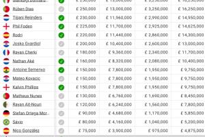 曼城球員薪資排行:(周薪/鎊)