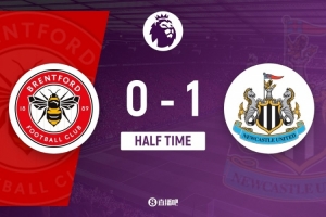 傷停補時5分鐘。上半場比賽結束,布倫特福德0-1紐卡斯爾聯(lián)。