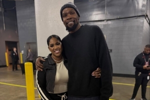 體育資訊1月17日訊 帕金斯更新社媒,曬出了他的妻兒去看火箭比賽,并在后臺和杜蘭特寒暄的照片。