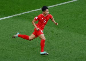 21歲的阮庭北就是越南隊的真大腿,他憑借一己之力扛著越南隊躋身四強。兩年前(2023年1月)的亞洲杯上,時任越南隊主帥的特魯西埃大膽啟用當時年僅19歲的阮庭北,并讓他首發出戰越南與日本隊的比賽。小將不負眾望獨造兩球,其中,他在第15分鐘就頭球攻破鈴木彩艷把守的城門!