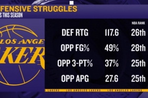 體育資訊1月17日訊 今日,ESPN總結了湖人本賽季至今糟糕的防守數據: