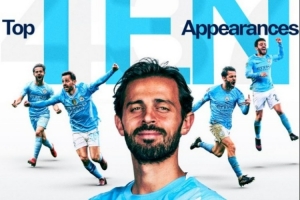 據統計,這是B席第437次代表曼城出場,躋身隊史出場次數前十,具體榜單如下: