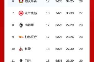 體育資訊01月18日訊 今日德甲第18輪,拜仁客場5-1萊比錫,最新積分榜如下: