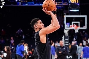 體育資訊1月18日訊 今天太陽客場對陣尼克斯,布克也特地選擇了一雙和紐約有著關聯的一個配色。