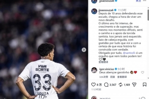 體育資訊1月18日訊 桑托斯19歲左后衛索薩即將加盟熱刺,他在社交媒體上發文,與桑托斯告別。