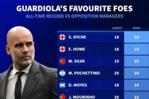 體育資訊11月10日訊 曼城在本輪英超焦點戰3-0完勝利物浦,瓜帥也取得了執教生涯對陣斯洛特的首勝。《轉會市場》也列出了瓜帥執教生涯對陣教練的勝場最多榜。