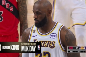 湖人VS猛龍第四節(jié),詹姆斯隔扣造成犯規(guī)走上罰球線,主場球迷喊起MVP的呼聲。