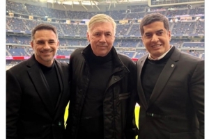 巴西國家隊官方更新社媒動態,曬出安切洛蒂與巴西足協副主席迪亞斯、國家隊總監卡埃塔諾在伯納烏的合照。