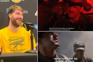 賽后,湖人球員德魯·蒂米身穿一件寫有“性感霸王龍(sexual tyrannosaurus)”字樣的T恤接受采訪。