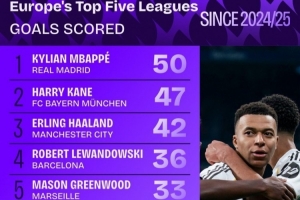 體育資訊1月19日訊 squawka統(tǒng)計了上賽季至今的五大聯(lián)賽射手榜情況,姆巴佩力壓凱恩居首。