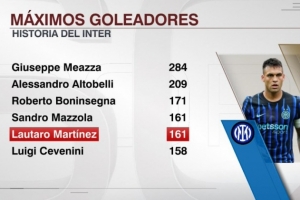 體育資訊11月10日訊 國米在本輪意甲焦點戰2-0力克拉齊奧,勞塔羅建功。數據統計顯示他也追平馬佐拉并列國米隊史射手榜第4位。