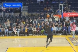 賽前,勇士球星庫里進行熱身,背身拋球助跑勉扣可惜未能成功。