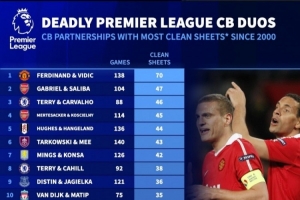 體育資訊1月20日訊 德國轉(zhuǎn)會市場統(tǒng)計了2000年以來英超中衛(wèi)組合的零封次數(shù),費迪南德、維迪奇70場零封居首,加布里埃爾、薩利巴47場零封次席。