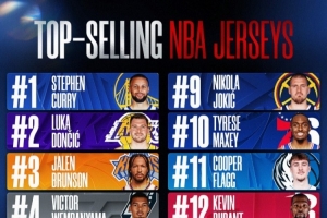 體育資訊1月21日訊 NBA官方公布了25-26賽季上半賽季球員的球衣銷量排行,該數(shù)據(jù)均基于NBAStore的銷售數(shù)據(jù)。