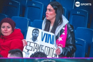 據TNT報道,一位球迷在伯納烏球場舉起支持維尼修斯的標語牌,上面寫著“維尼修斯,我們與你同在”,表達對這位皇馬前鋒的支持,此前的比賽中,維尼修斯曾遭到皇馬球迷的噓聲對待。