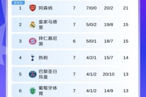 第7輪首個比賽日過后,阿森納7戰全勝領跑,皇馬暫升第2,曼城不敵博德閃耀后跌至第7,國米遭遇三連敗后跌出前8,暫時來到第9位。