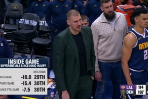 約老師缺陣后 掘金場均籃板減少10個 場均內線得分減少15.4分 場均二次進攻得分減少7.5分