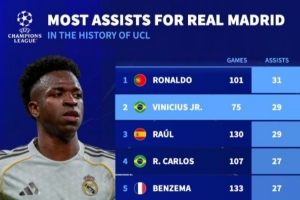 體育資訊1月21日訊 本輪歐冠,皇馬6-1大勝摩納哥,維尼修斯送出2次助攻,根據德轉統計,維尼修斯歐冠助攻數升至皇馬隊史第二。