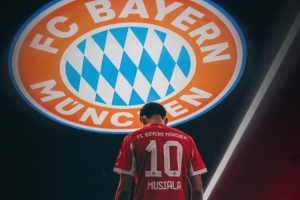 體育資訊1月21日訊 穆西亞拉更新社媒動態,曬出與拜仁隊徽的合照。